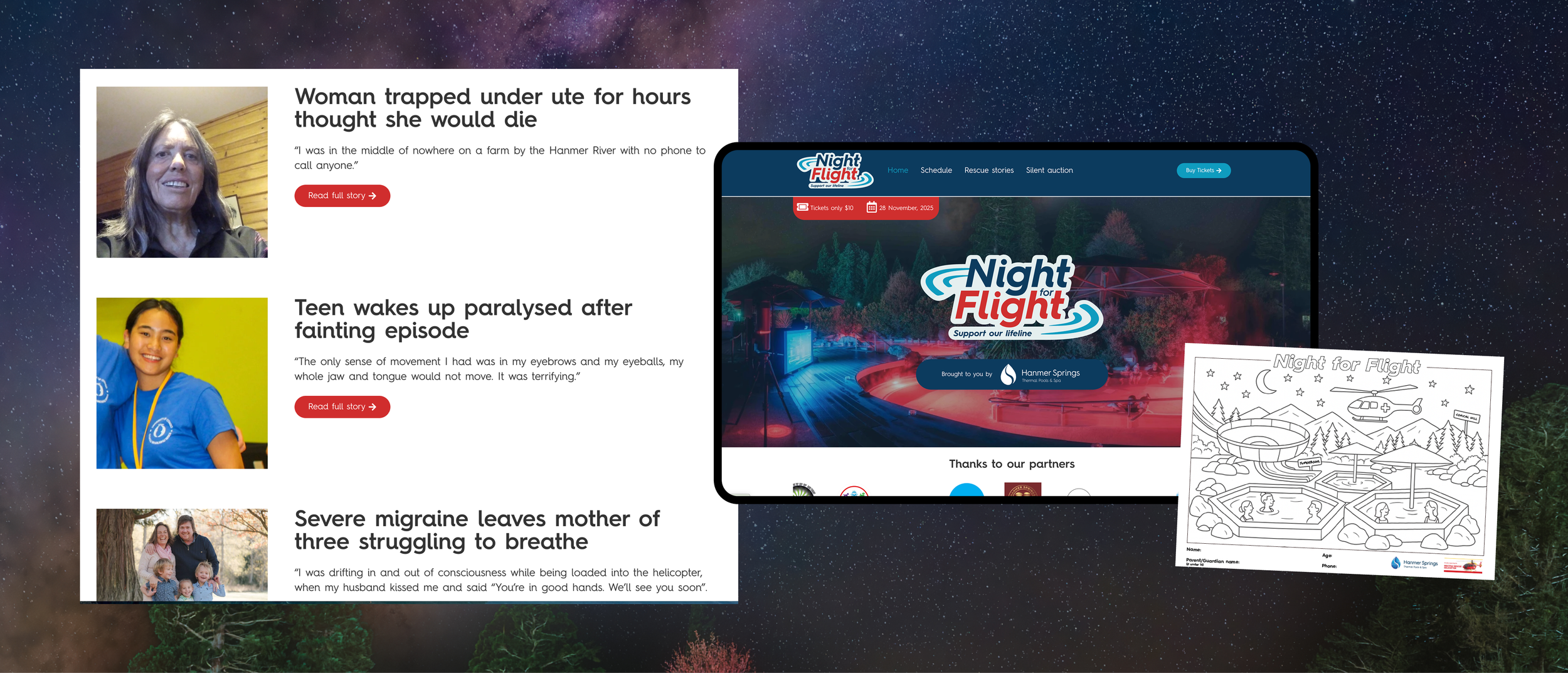 From there, we built a campaign around real people and real stories, not statistics and donation targets. Six in-depth case studies and dozens of community-submitted rescue testimonials sat at the heart of a purpose-built campaign website, nightforflight.co.nz, created specifically for the event. The site hosted integrated ticketing, raffles, auctions, and donations plus a fundraising tracker.